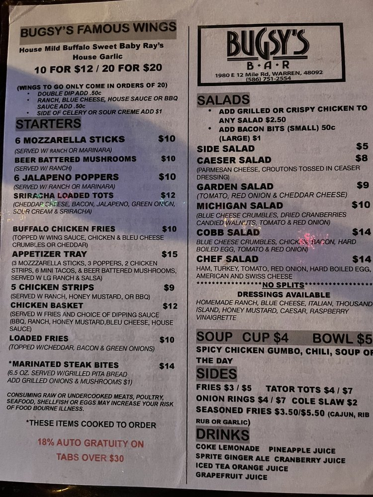 Bugsy’s, a beer bar specializing in chicken wings and American cuisine, offers a diverse menu that caters to a range of preferences. Located in Warren, MI, Bugsy’s prides itself on providing a unique dining experience with options for vegetarians and various amenities like outdoor seating, a pool table, and free Wi-Fi. The standout dishes include their Philly Cheesesteaks, such as the classic Philly Cheesesteak, The Cheesehead Philly, and The Philly Po' Boy, all bursting with flavorful ingredients. For those looking to try a variety, Bugsy’s offers combo meals with a choice of sides like fries, tater tots, and mozzarella sticks. Overall, Bugsy’s is a great spot for groups to enjoy delicious food, refreshing drinks, and a relaxed atmosphere.